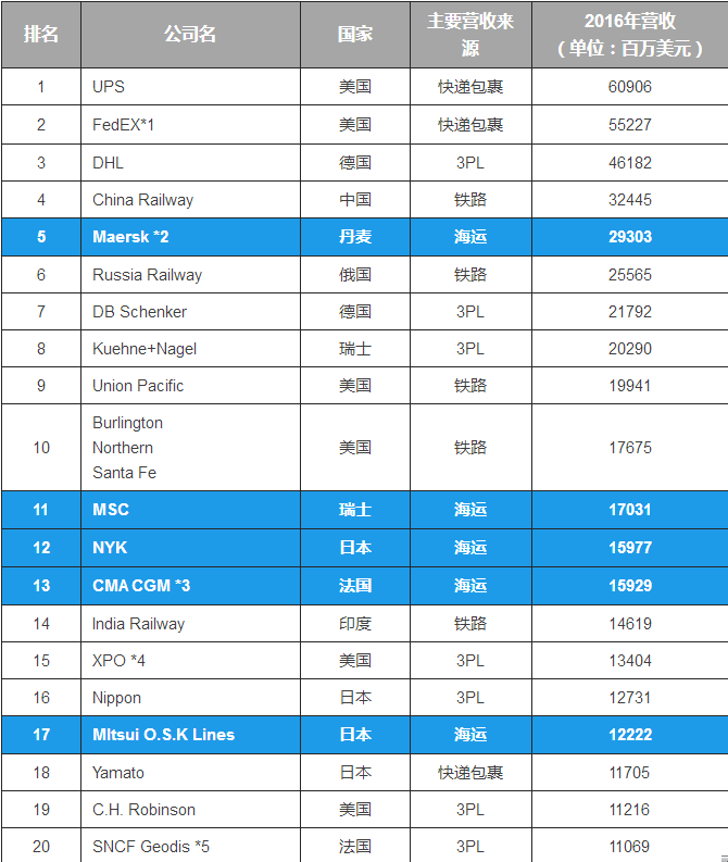 这份榜单是基于2016年全球物流服务商( Transportation service provider)的年度营收数据,同时分析了其主要营收的业务来源,参评企业包括集装箱航运公司,铁路,快递及全球物流3PL等企业!